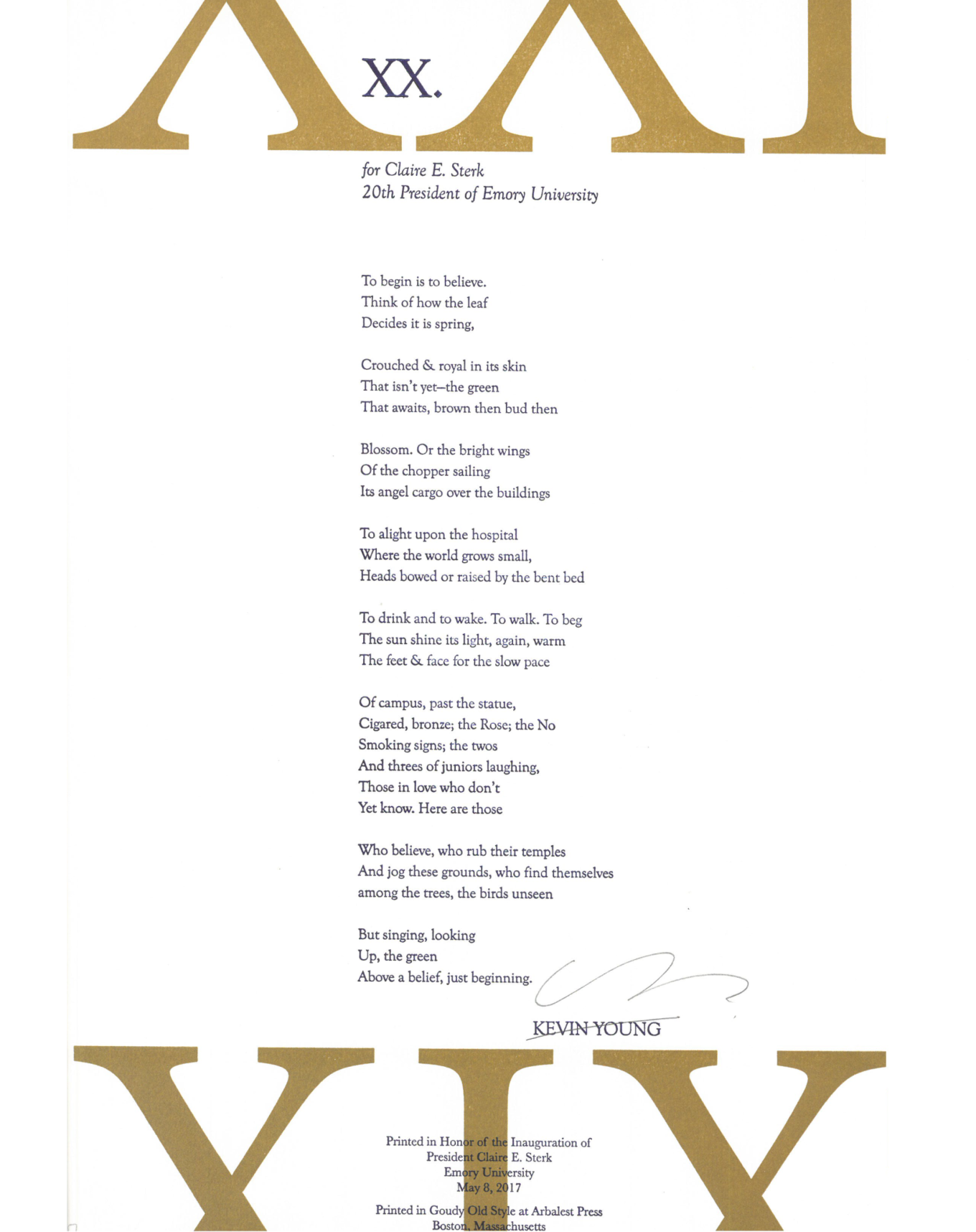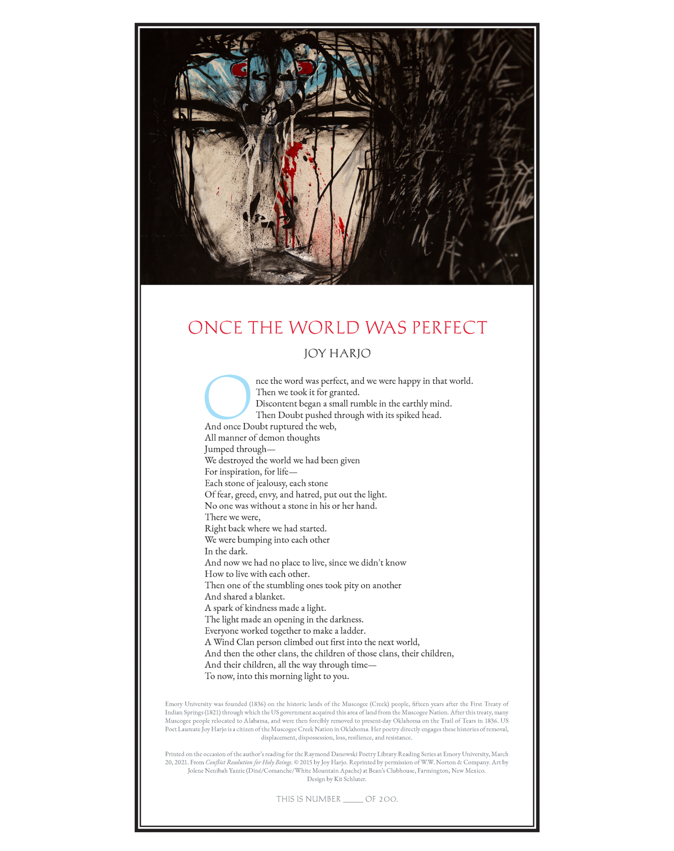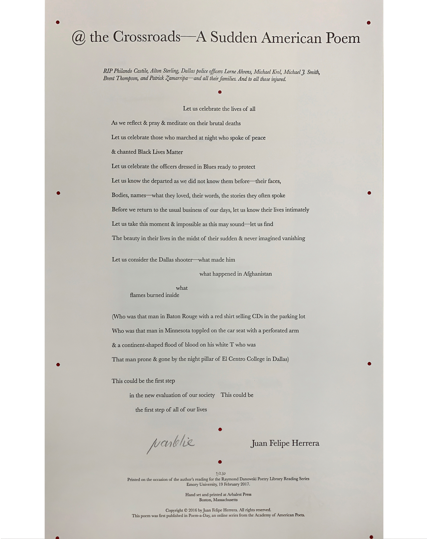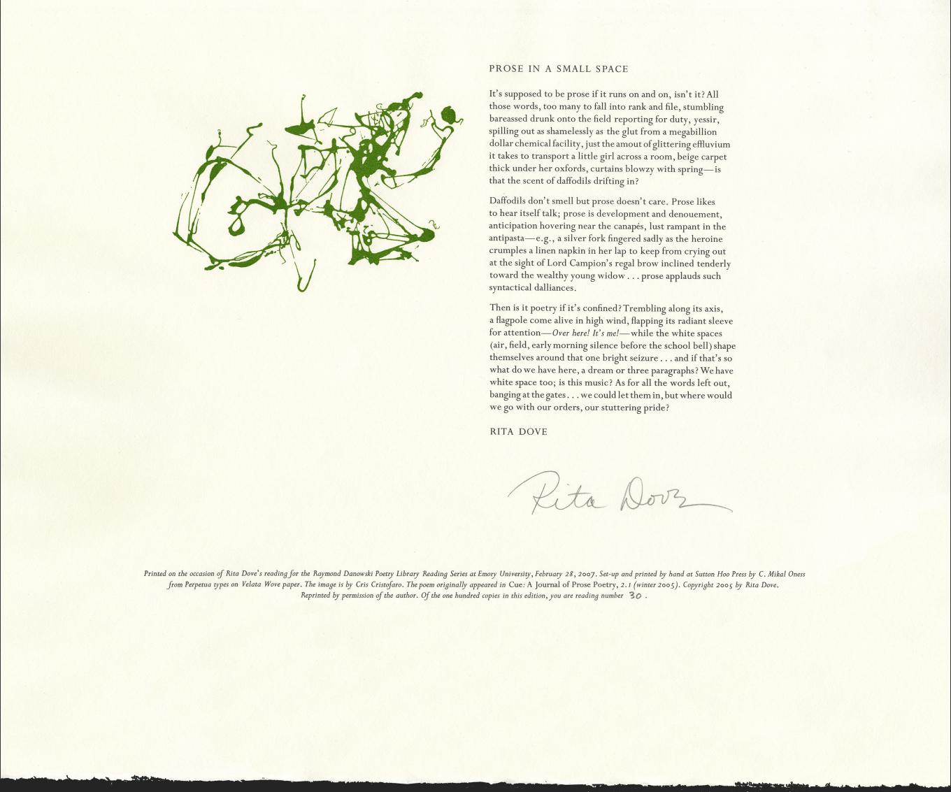 The Rose Library commemorates our Raymond Danowski Poetry Library Reading Series and other major events with broadsides designed and produced in limited editions. Broadsides are for sale for $50 each on a first come, first serve basis. Sales support the Rose Library's poetry collections and programming. To purchase a broadside please reach out to Erin Glogowski, Operations Program Coordinator, at eglogow@emory.edu.