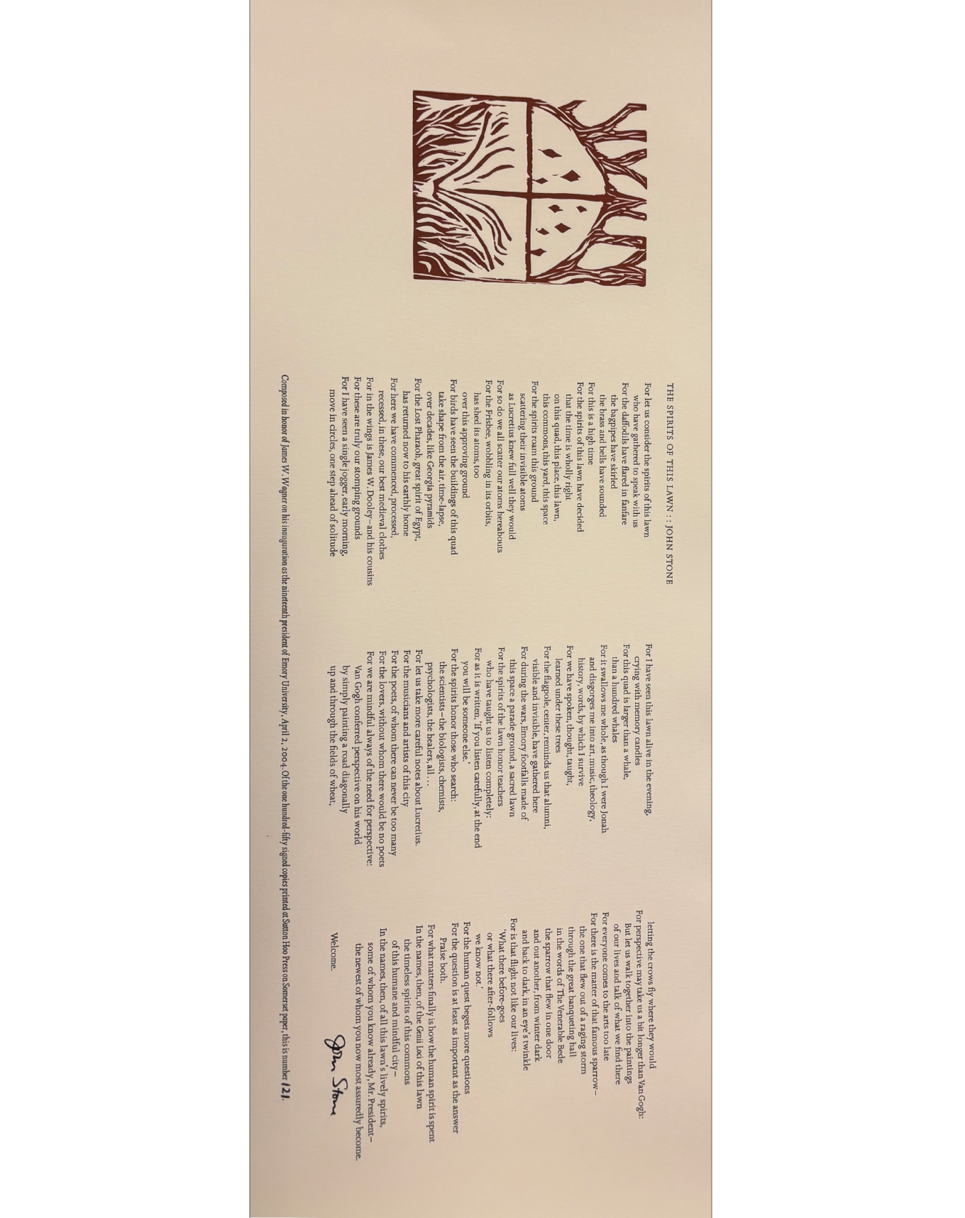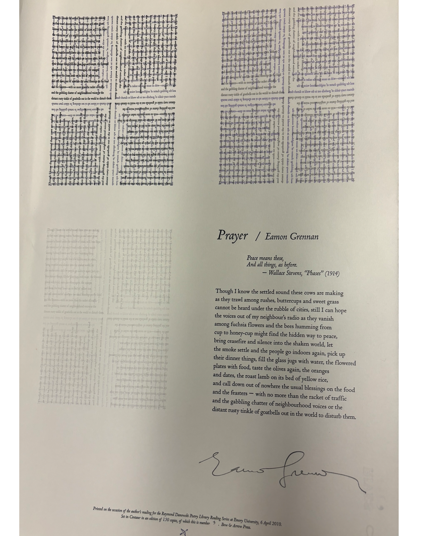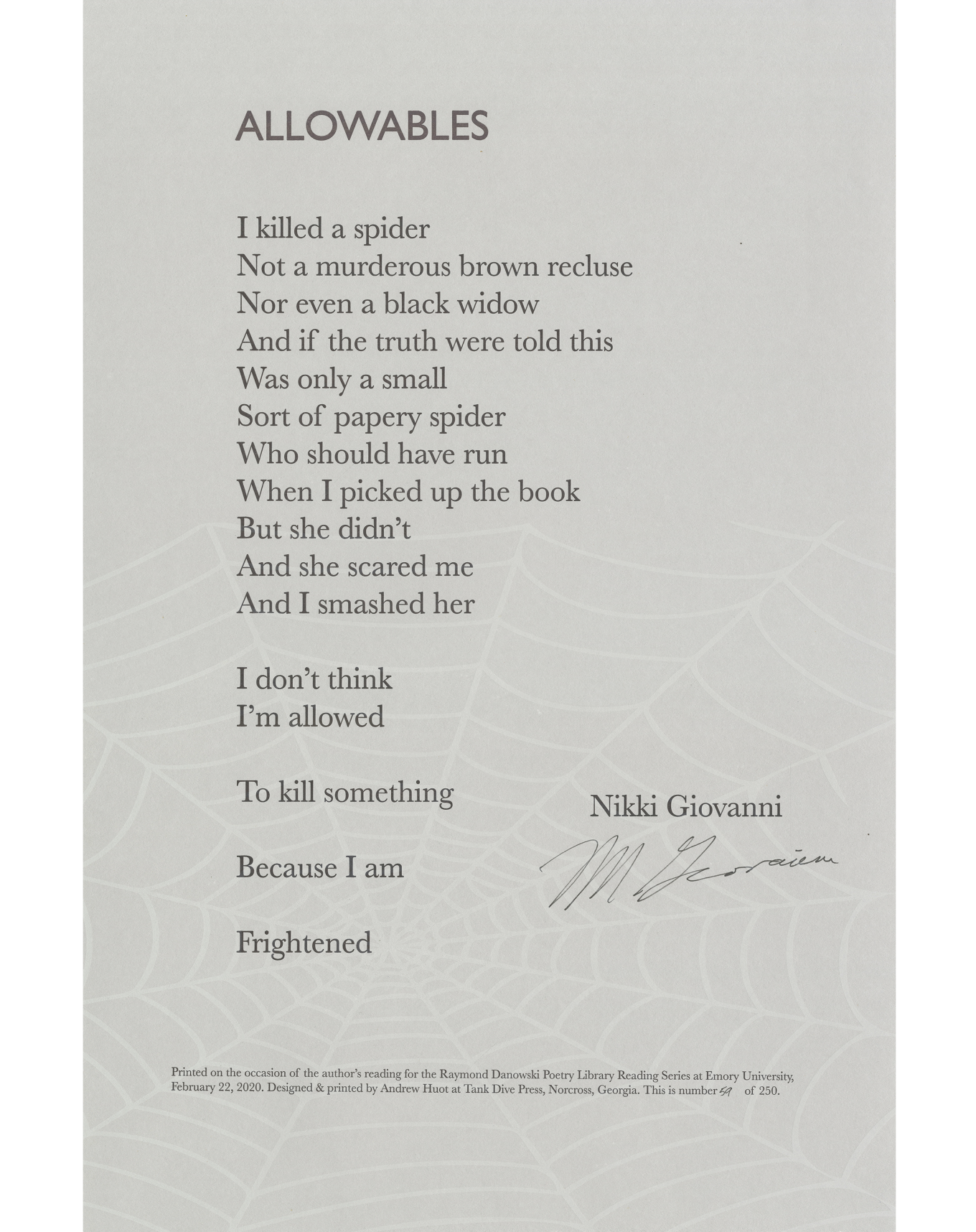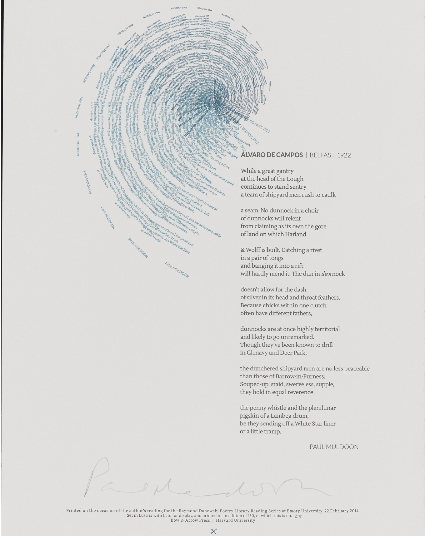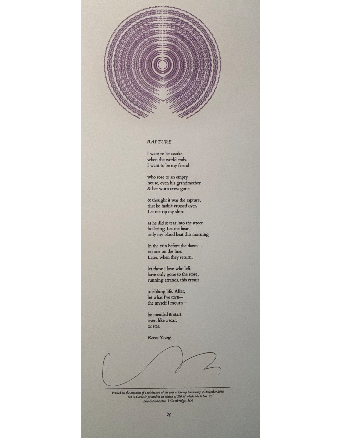 The Rose Library commemorates our Raymond Danowski Poetry Library Reading Series and other major events with broadsides designed and produced in limited editions. Broadsides are for sale for $50 each on a first come, first serve basis. Sales support the Rose Library's poetry collections and programming. To purchase a broadside please reach out to Erin Glogowski, Operations Program Coordinator, at eglogow@emory.edu.